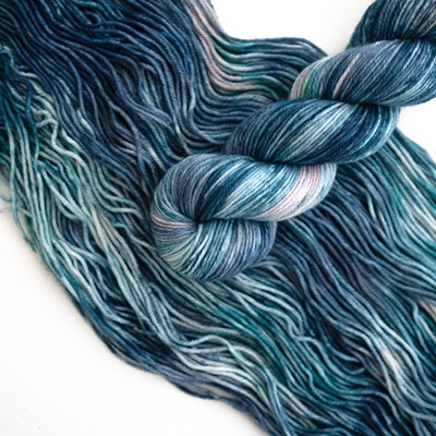 Variegated: This colorway consists of various shades of deep blue, turquoise, steel blue, grey and blush pink.