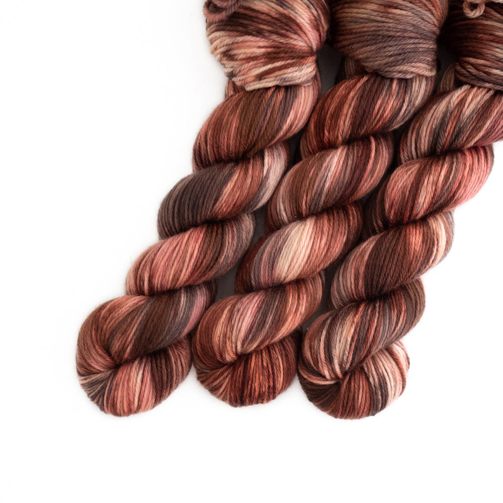 Variegated: This colorway consists of various shades of brown, reddish brown, coral peach, and peachy beige.
